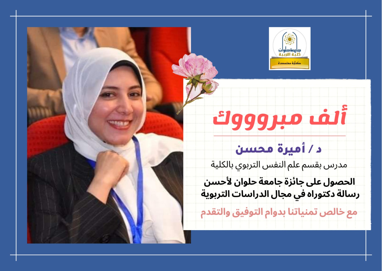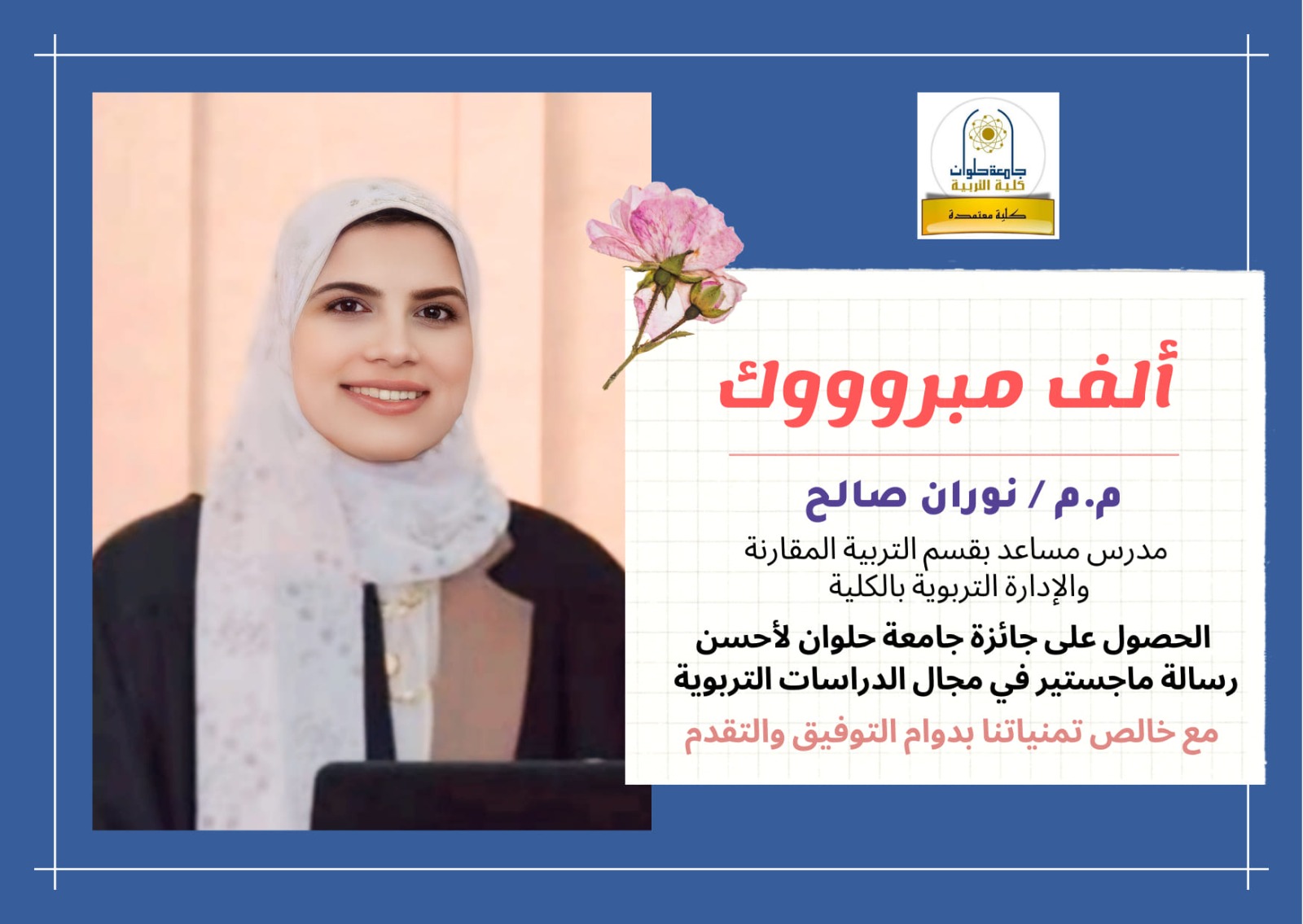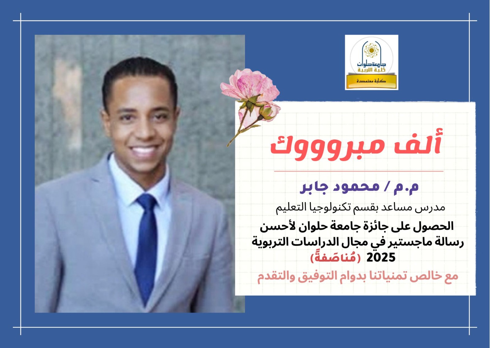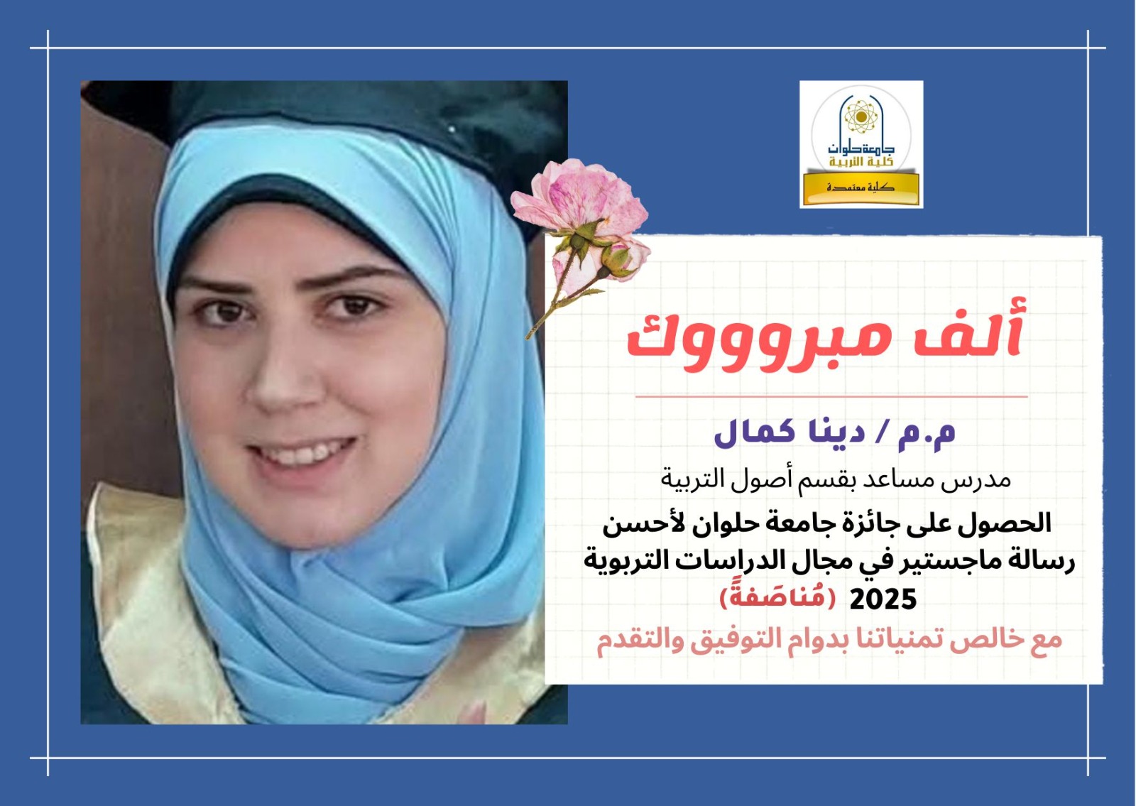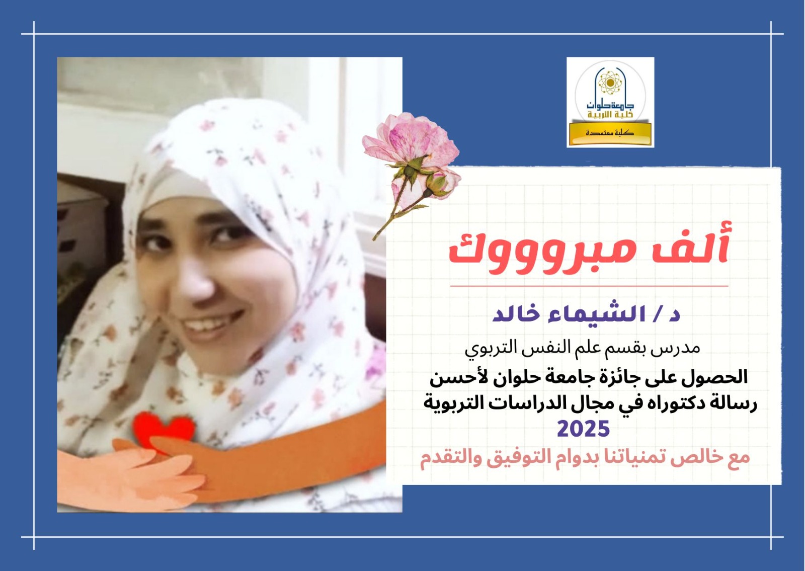 تتقدم كلية التربية بجامعة حلوان بخالص التهنئة إلى باحثيها المتميزين لحصولهم على "جائزة أحسن رسالة" في مجال الدراسات التربوية لعام 2024، تقديراً للأبحاث المبتكرة وذات الجودة العالية. وحصد الجائزة كل من: